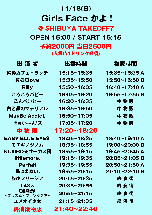 純粋カフェ・ラッテ / 143∽ / きゅい〜ん’ズ / littlemore. / Parfait / ユメオイ少女 / 旋律フリージア / MayBe Addict. / ころころパピー / こんぺいとー / Rilly / 虹色幻想曲〜プリズム・ファンタジア〜 / モエギノジノム / 白と黒のマテリアル / 僕のClove / NIJIIRO★サーカス団 / 黒は着ない。/ BABY BLUE EYES