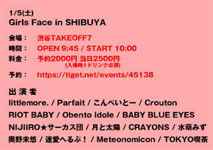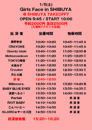 littlemore. / Parfait / こんぺいとー / Crouton / RIOT BABY / Obento Idole / BABY BLU EYES / NIJIIRO★サーカス団 / 月と太陽 / CRAYONS / 奥野未悠 / 迷愛へるぷ! / Meteonomicon / 水萌みず / TOKYO喫茶