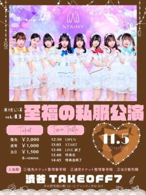 【公演名】STAiNY単独公演vol.43 至福の私服公演【出演】STAiNY【開場/開演】12:50 / 13:05【前売/当日】優先2,000円/通常1,000円/当日+500円(各+1D600円)