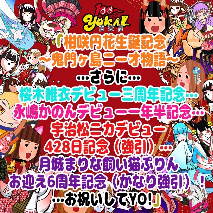 100-YOKAI単独宴「柑咲円花生誕記念〜鬼門ヶ島ニーオ物語〜 …さらに…桜木唯衣デビュー3周年記念…永嶋かのんデビュー1年半記念…宇治松ニカデビュー428日記念(強引)…月城まりな飼い猫ぷりんお迎え6周年記念(かなり強引)!…お祝いしてYO!」