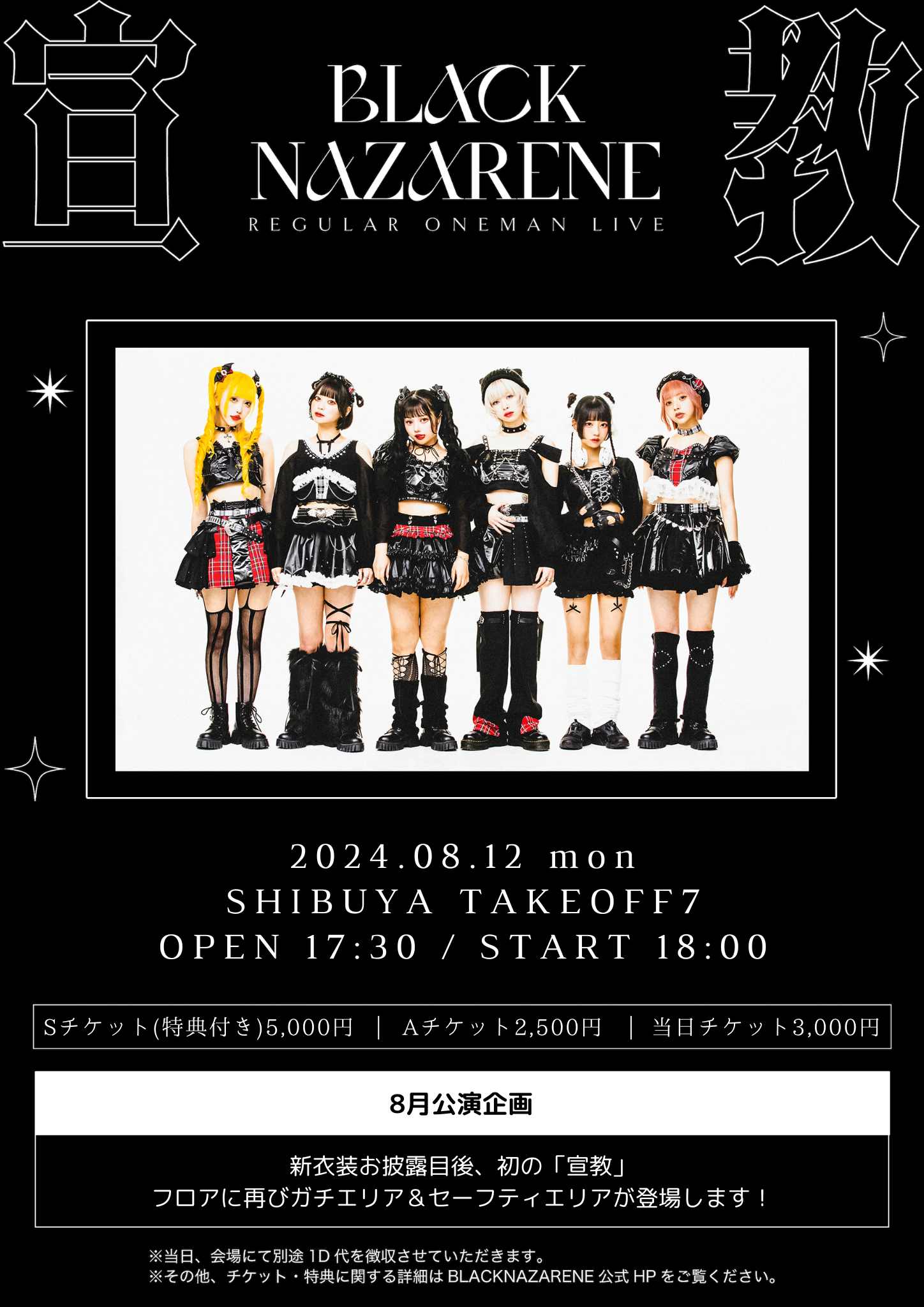 【公演名】BLACKNAZARENE定期公演「宣教」【出演】BLACKNAZARENE【開場/開演】17:30 / 18:00【前売/当日】Sチケット¥5,000 / Aチケット¥2,500 / 当日¥3,000