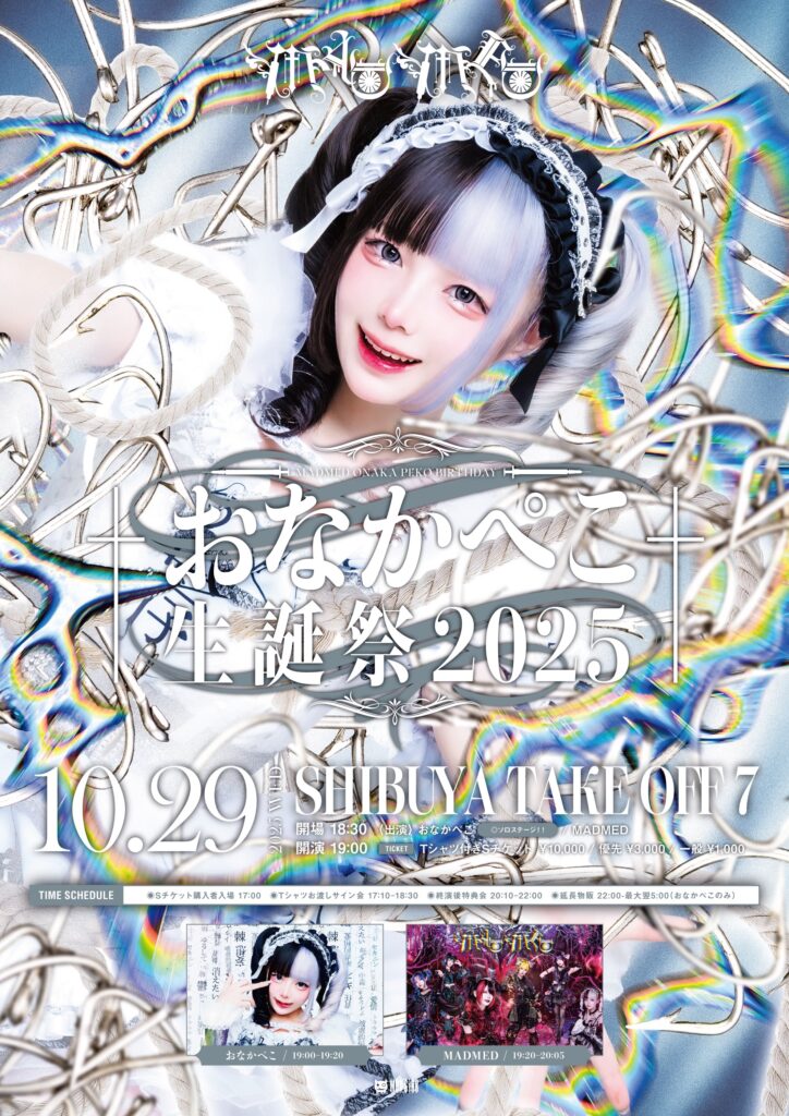 【公演名】『おなかぺこ生誕祭2025』【出演】おなかぺこ / MADMED【開場/開演】18:30 / 19:00【TICKET】Tシャツ付きSチケット¥10,000 / 優先¥3,000 / 一般¥1,000 (各+1D¥600)