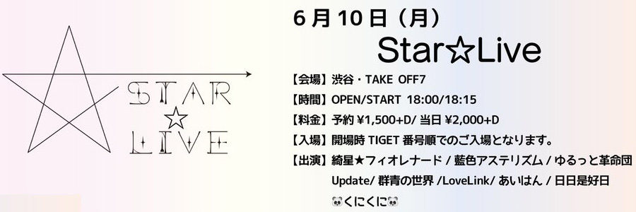 【公演名】 『Star☆Live』 【出演】 綺星★フィオナード / 藍色アステリズム / ゆるっと革命団 / Update / 群青の世界 / LoveLink / あいはん / 日日是好日 / くにくに / にゅ〜わ … Continue →